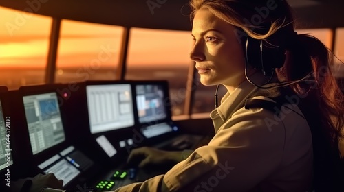 Air traffic controller in the control tower working on his screen, Woman working as air traffic controller.