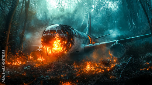 aeroplane, crash, fire, forest, disaster, accident, plane, burning, wreckage, smoke, danger, transportation, travel, aviation, emergency, inferno, flames, destruction, impact, survival, fear, tragedy, death, wildfire, air, safety, risk, catastrophic, dark, wood, nature, lost, eerie, skittish, cinematic