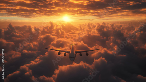 Airplane flying through the sky at sunset with clouds in the background