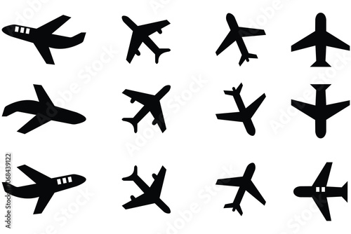 Airplane icon, vector set. Silhouettes of airplanes vector. Plane icon, logo design. Aircraft vector sign symbol. Travel and transport icon, symbol. Cargo, aviation, airliner, Vector illustration.