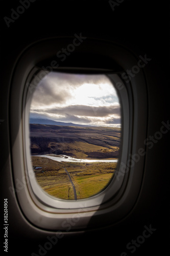Airplane interior with window view of the highlands of Iceland. Concept of travel and air transportation