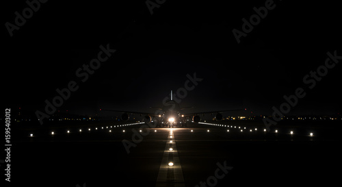 aeroplane, landing, night, runway, light, illumination, symmetry, aviation, aerodrome, transportation, travel, darkness, perspective, aircraft, terminal, guidance, approach, aeroplane, airstrip, navigation