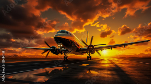 Airplane on runway beneath dramatic clouds and glowing sky on background. Amazing sunset, twilight. Symbolizing travel and adventure. Copy space.