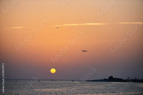sunset, sea, sun, sky, ocean, water, beach, sunrise, nature, landscape, evening, horizon, orange, cloud, cloud, summer, beautiful, dusk, travel, coast, red, sundown, light, bird, aeroplane, take off, flight, aerodrome