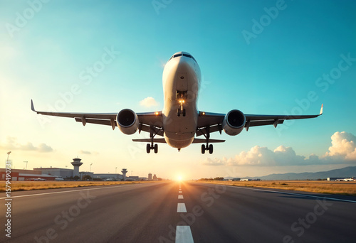 Airplane Taking Off at Sunset – Scenic Aviation Moment with Golden Sky
