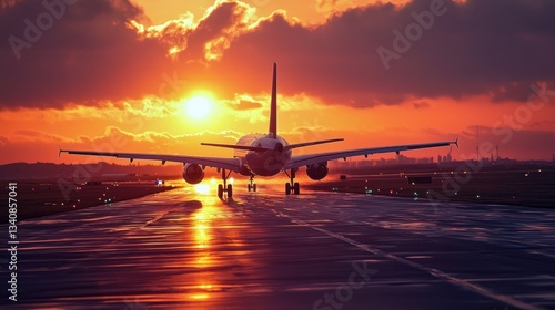 aeroplane, sunset, aerodrome, runway, sky, cloud, flight, travel, journey, aviation, transport, departure, arrival, horizon, gold, orange, red, colours, silhouette, vehicle, wing, engine, jet, plane, airliner, city, building, landscape, scene, evening, twilight, atmosphere, light, ground, path, distance, dramatic, spectacular, beautiful