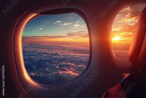 aeroplane, window, sunset, view, sky, cloud, flight, travel, journey, aviation, aircraft, horizon, scenery, tranquil, serene, beautiful, sunlight, dusk, twilight, aerial, up high, atmosphere, peaceful, scenic, panorama, flying, airborne, landscape, vacation, tour tourism, inflight, airline, glow, orange, cloudscape, wanderlust, adventure