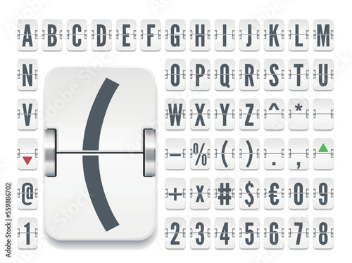 Airport flip board regular font for stock exchange rates . White terminal mechanical scoreboard alphabet with numbers to display destination and departure vector illustration