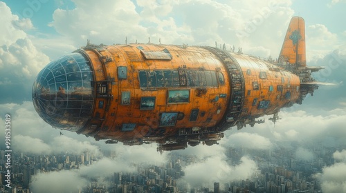 airship, flying, cloud, sky, city, building, urban, futuristic, fantasy, artwork, art, concept, design, machine, technology, craft, structure, flight, travel, adventure, science, fiction, imagination, dream, journey, exploration, creative, imaginative, innovation, metallic, orange, yellow, window, glasses, metal, detail, digital, illustration, retro, vintage, modern, abstract