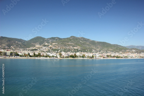 Alanya, TURKEY - August 10, 2013: Travel to Turkey. Greenery. Flowers. Green hills. The mountains. Rocks, wildlife of Turkey. Forest and clear blue sky. The waves of the Mediterranean Sea. Water surfa