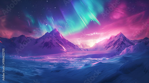 Alaskan aurora borealis over a frozen landscape vibrant colors lighting up the cold night breathtaking winter scene copy space