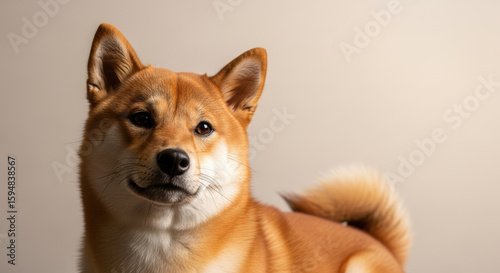 Alert shiba inu dog sitting against a neutral background with focused expression and fluffy curled tail