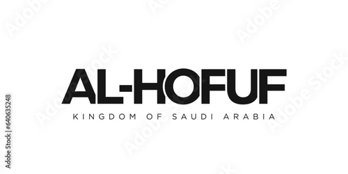Al-Hofuf in the Saudi Arabia emblem. The design features a geometric style, vector illustration with bold typography in a modern font. The graphic slogan lettering.