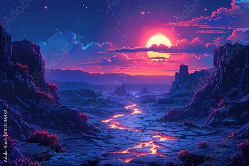 landscape, alien, sunset, lava, river, canyon, rock, star, night, sky, cloud, mountain, purple, blue, pink, red, orange, glow, light, dark, vibrant, colours, fiery, hot, cold, surreal, fantasy, mystical, dramatic, majestic, beauty, awe, wonder, cosmic, space, extraterrestrial, planet, atmosphere, scene, view, art, digital