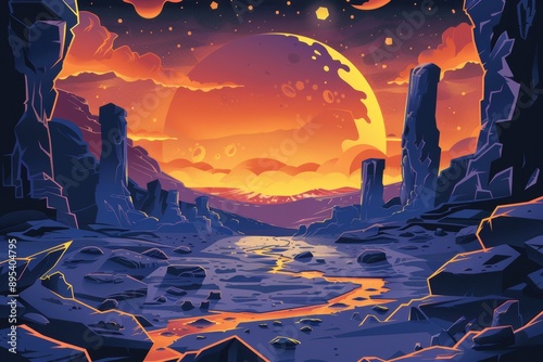 alien, landscape, moon, lava, river, rock, mountain, sky, star, planet, orange, blue, purple, night, fantasy, art, illustration, background, poster, print, wallpaper, surreal, mysterious, beautiful, strange, foreign, exotic, exploration, discovery, adventure, travel, journey, destination, unknown, unexplored, uninhabited, hostile, inhospitable