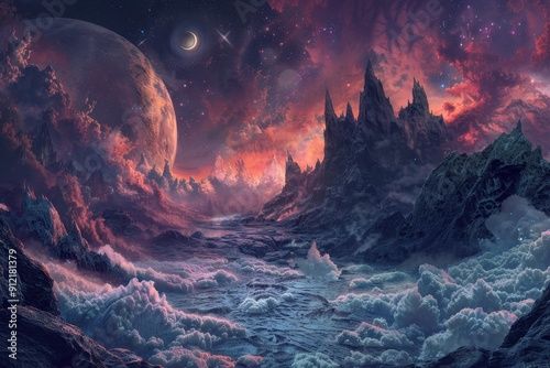 alien, landscape, planet, large, mountain, star, night, sky, cloud, pink, red, purple, blue, space, huge, distant, nebula, cosmic, celestial, aethereal, fantasy, dreamscape, mystical, surreal, magical, awe, wonder, immensity, beauty, mystery, imagination, infinite, creation, universe, majestic, grand, solitude, calmness