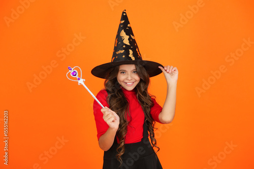 All Hallows witch girl. Girl in witch costume hold magic wand. Happy Halloween. Girl witch in Halloween costume isolated on orange. Trick or treat. Halloween costume party. Bat decorations