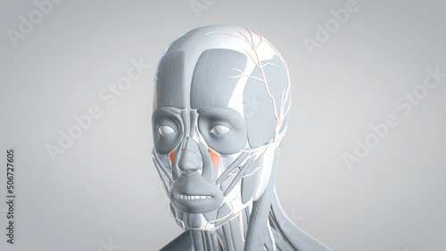 All muscles of the face, detailed display of face muscles, human muscular system, 3D human anatomy, 3D render