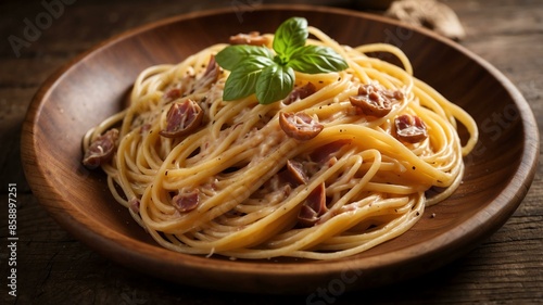 carbonara, spaghetti, wooden, plate, pasta, food, italian, meal, sauce, dish, dinner, cookery, noodle, lunch, tomatoes, white, basil, cheese, epicure, delicious, healthy, linguine, cooking, seafood, shrimp, tasty