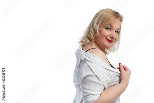 Alluring Winsome Mature Confident Caucasian Woman in White Sensual Shirt Posing With Hands Folded Over White