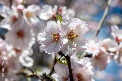 almond blossoms in spring as closeup with blurred background