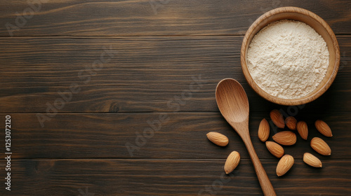 Almond flour and whole almonds in wooden bowl with spoon on rustic wooden table. This evokes sense of natural ingredients and healthy cooking