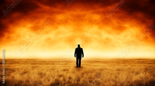 sunset, fiery, apocalypse, man, silhouette, field, grass, orange, red, sky, cloud, dramatic, atmospheric, moody, desolate, lonely, isolated, hope, despair, end of the world, survival, journey, adventure, mysterious, ominous, fear, danger, uncertainty, future, hopeful, golden hour