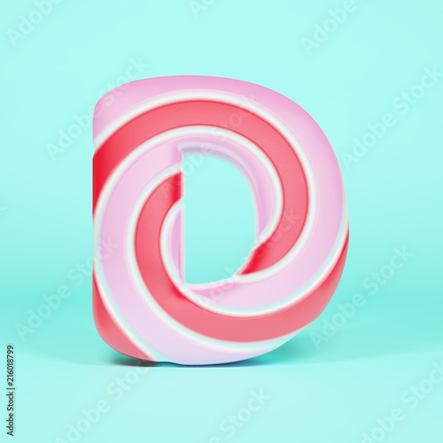 Alphabet letter D uppercase. Christmas font made of pink and red striped lollipop. 3D render on blue background.