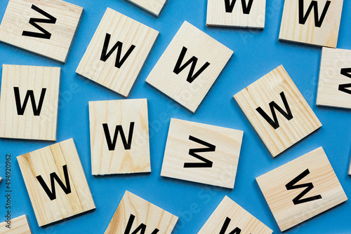 Alphabet W on wooden block lay flat on blue background. 5Ws concept