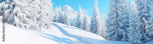 Alpine forest with snowy path, a narrow trail winding through snow-laden trees, inviting and tranquil winter scene
