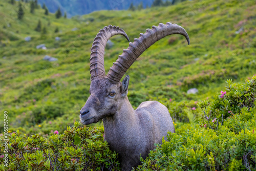 Alpine ibex, Capra ibex, steinbock European species of goat living in the Alps. Mountain goat in the Alps near Chamonix Mont Blanc. Wild goat in the natural environment, mammal wildlif of the Alps