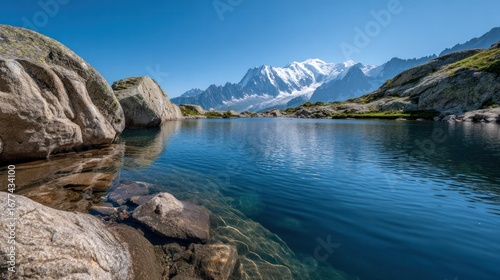 Alpine Lake Reflection: Serene alpine lake mirroring majestic snow-capped mountains under a clear blue sky. a scene of breathtaking natural beauty and tranquility.