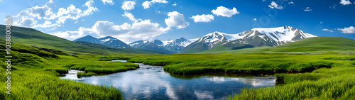 alpine lake surrounded by lush green meadows and snow-capped mountains under a bright blue sky, showcasing the serene beauty of a natural landscape