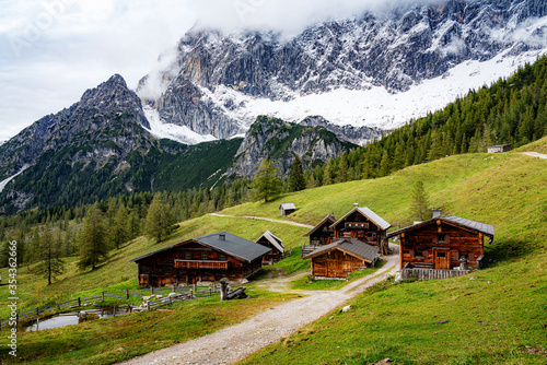 Alpine mountain scenery with traditional wooden farm houses in summer, Styria, Austria