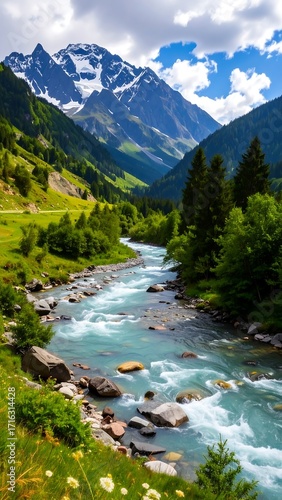 Alpine river flowing through a valley, snow-capped peaks in the background. Lush greenery, vibrant colors