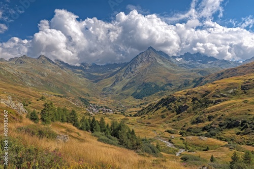 mountain, vale, village, alpine, sunny, cloud, peak, landscape, scenic, autumn, colours, nature, green, yellow, brown, rocky, river, clear, sky, high, misty, vegetation, grass, tree, wood, lush, cloudscape, panorama, tranquil, elevated, view, distance, rugged, summit, hill, wildflower, meadow, dried, flowing, water, travel, hiking
