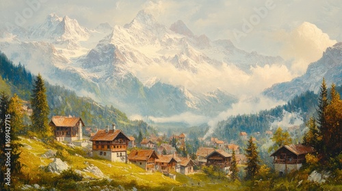 mountain, village, alpine, landscape, nature, scenic, hill, vale, house, tree, snow, peak, cloud, sky, art, painting, swiss, idylli, serene, peaceful, tranquil, charming, picturesque, breathtaking, vista, view, panorama, rural, countryside, cabin, home, timberland, forest, evergreen, fir, pine, spruce, meadow