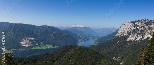 Alps mountain lake Grundlsee with village in valley. Travel lifestyle copy space background, Austria landscape