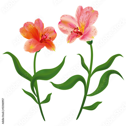 Alstroemeria flowers with green leaves. Isolated, white background.