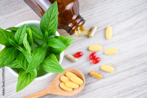 Alternative herbal medicine, vitamin and supplements from natural, pills and capsules on rustic wood background, drug concept