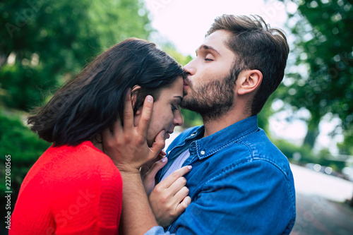 Always be with you. Beautiful smiling couple in love are walking together. Woman and man are hugging, kissing and have a fun together in park outdoors