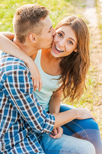 couple, woman, man, two people, togetherness, love, romance, bonding, hugging, lifestyle, people, touching, dating, family, summer, outdoors, sitting, young adult, fun, caucasian, avocation, relaxation, carefree, beautiful, attractive, casual attire, confidence, enjoyment, smiling, happiness, cheerful, candid, vitality, well-being, kissing
