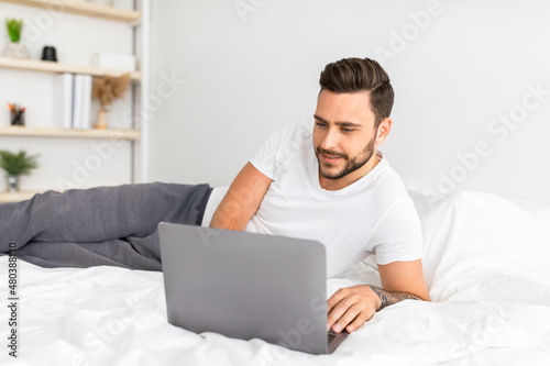Always online. Positive young man working on laptop distantly, lying on bed, waking up and using computer, free space