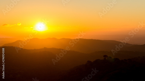Amanecer en los bosque de pinos en las montañas de Sierra Morena, Cordoba