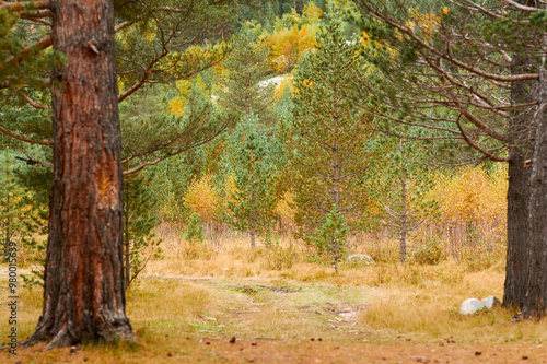 Amazing autumn forest. Red and yellow leaves of trees.