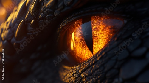 Amazing close-up shot of a dragon's eye with detailed textures and lively colors during a mythical fantasy landscape