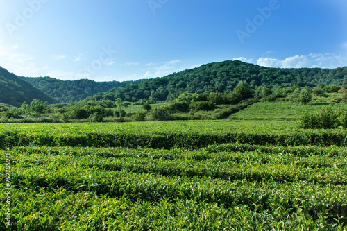 Amazing landscape view of tea plantation in sunny day. Nature background with blue sky and foggy.