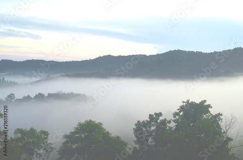 Amazing scenery of idyllic countryside with rolling hills veiled in morning fog. Aerial view of hill on a foggy spring morning