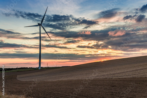 Amazing sunset at countryside with wind turbine in autumn, Poland