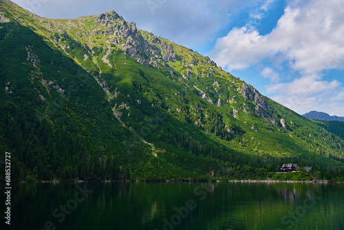 Amazing view on mountains range near beautiful lake at summer day. Tatra National Park in Poland. Panoramic view on Morskie Oko or Sea Eye lake in Five lakes valley